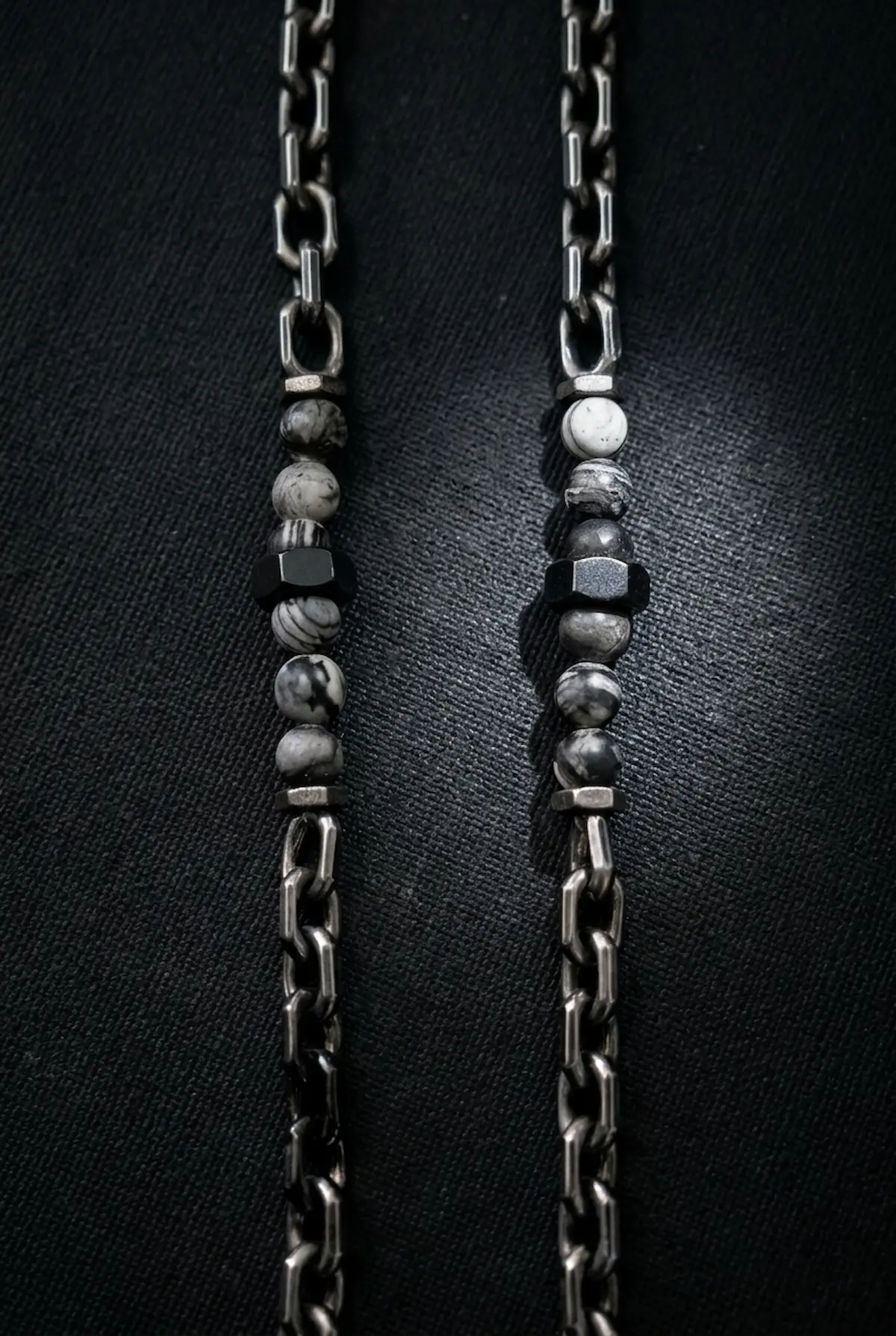 El acero industrial sella la protección mientras las piedras de jaspe telaraña aquieta el pensamiento con propiedades metafísicas de paz, consuelo, sanación y conexión a tierra. Una armadura de fe para quien transforma el metal en destino y el camino en su templo.