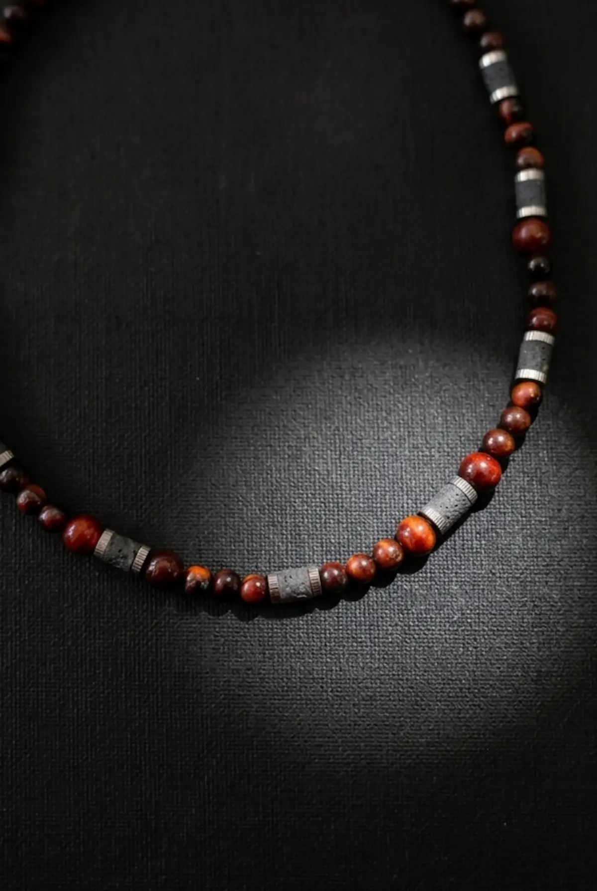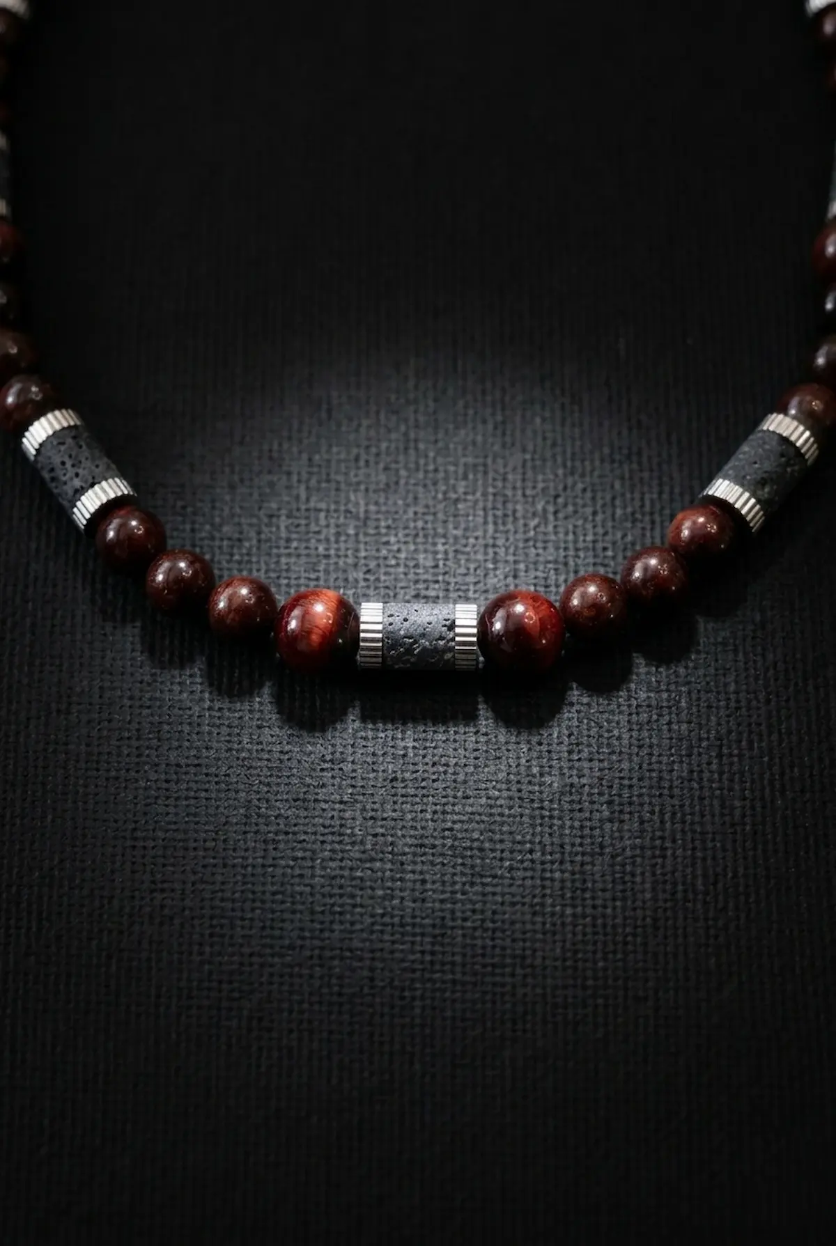 Unión sagrada de magma y visión, este collar corto despierta el fuego que duerme en la garganta. Piedra viva de ojo de tigre rojo y piezas en acero para quien domina su propio destino con la fuerza absoluta del volcán.