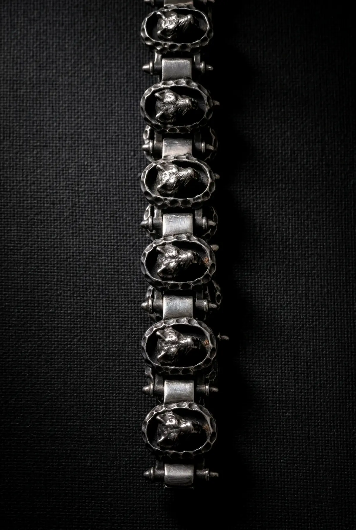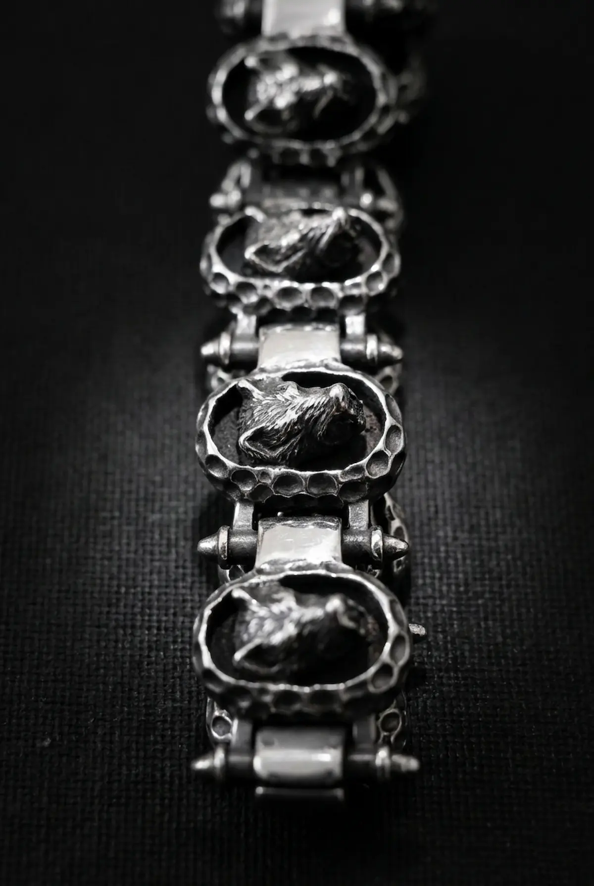 Mandíbulas de acero entrelazadas para custodiar el pulso del líder. Una armadura de instinto y sombra diseñada para devorar el miedo y elevar la voluntad de quien domina su propio camino.